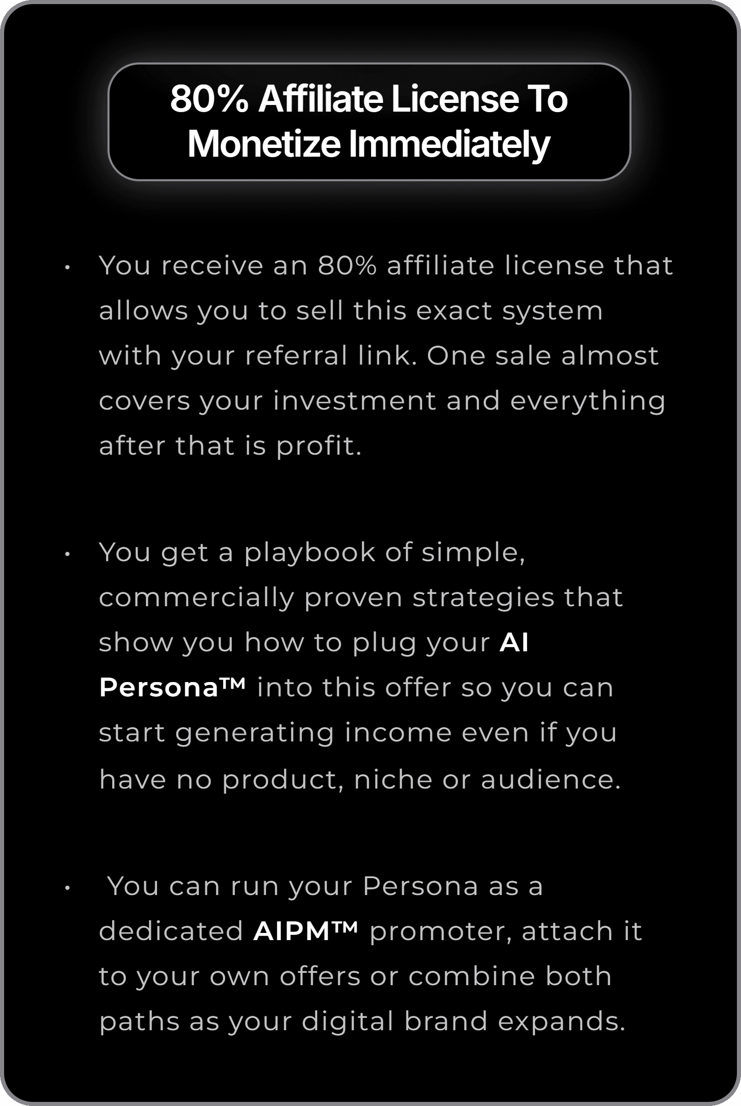 Your AI Persona™ can sell your own offers or earn you 80% commission through your AIPM™ affiliate license. You can generate real income from day one without needing a niche, product or plan.