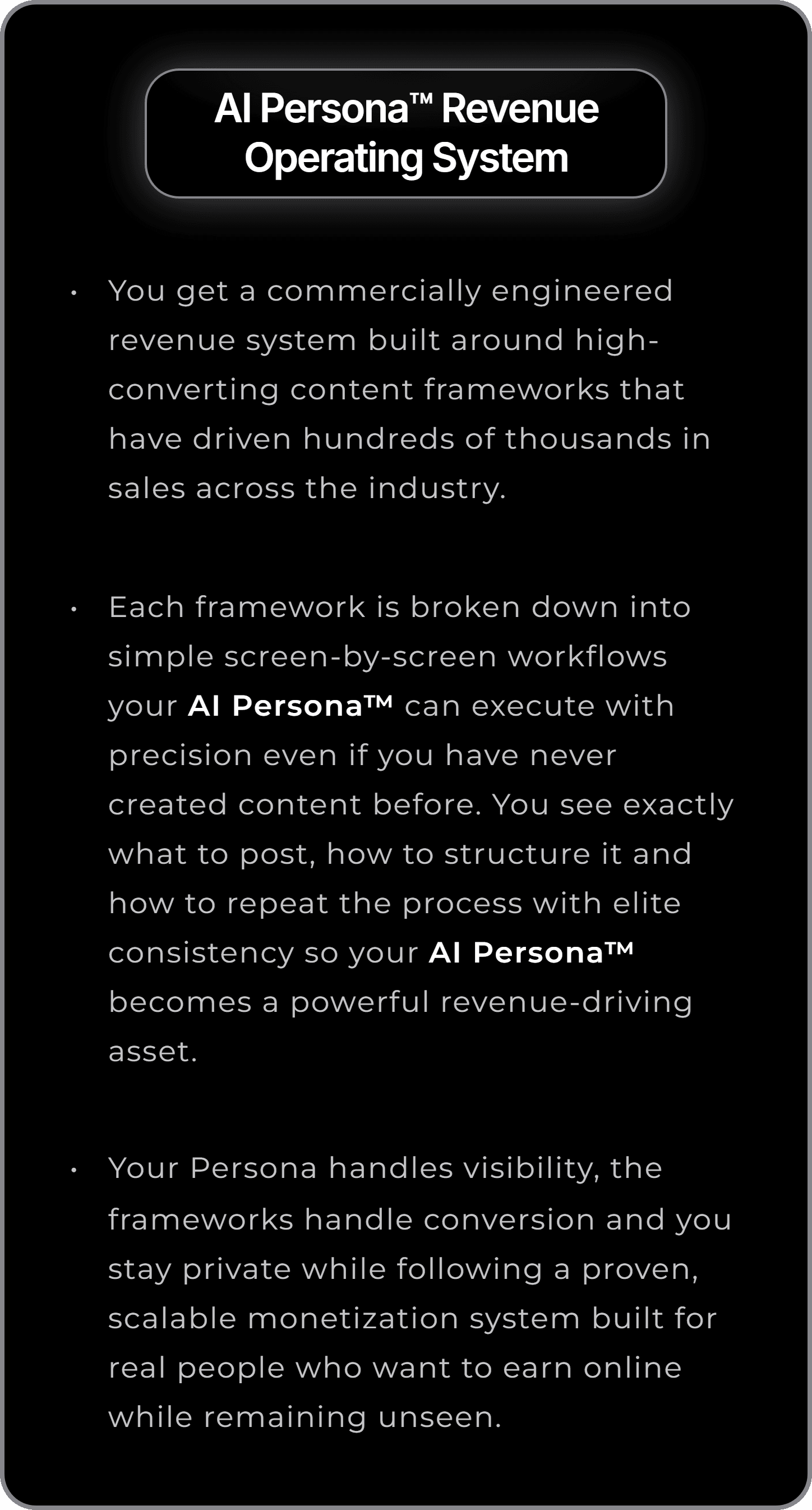 Your Persona handles visibility, the frameworks handle conversion and you stay private while following a proven, scalable monetization system built for real people who want to earn online while remaining unseen.