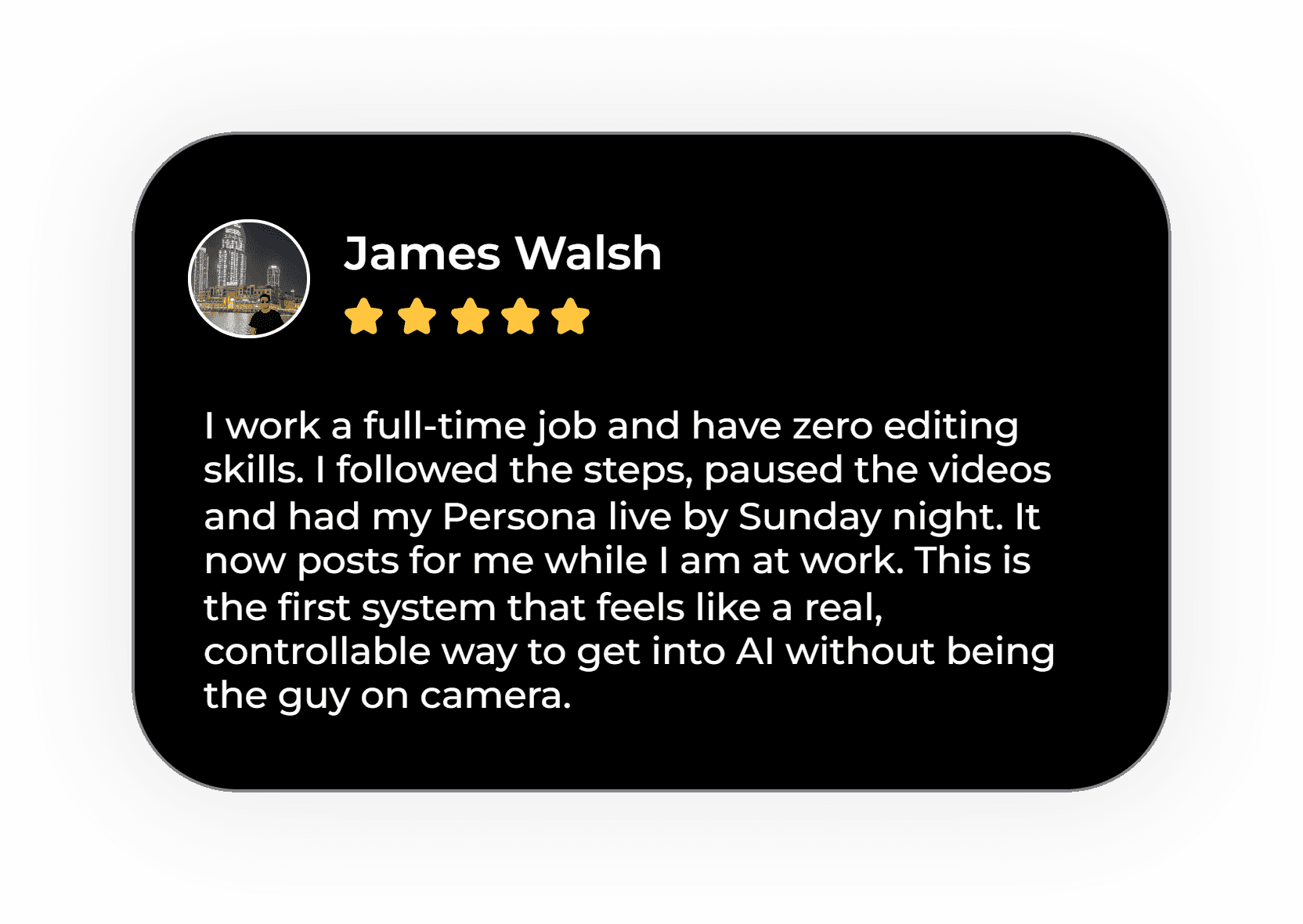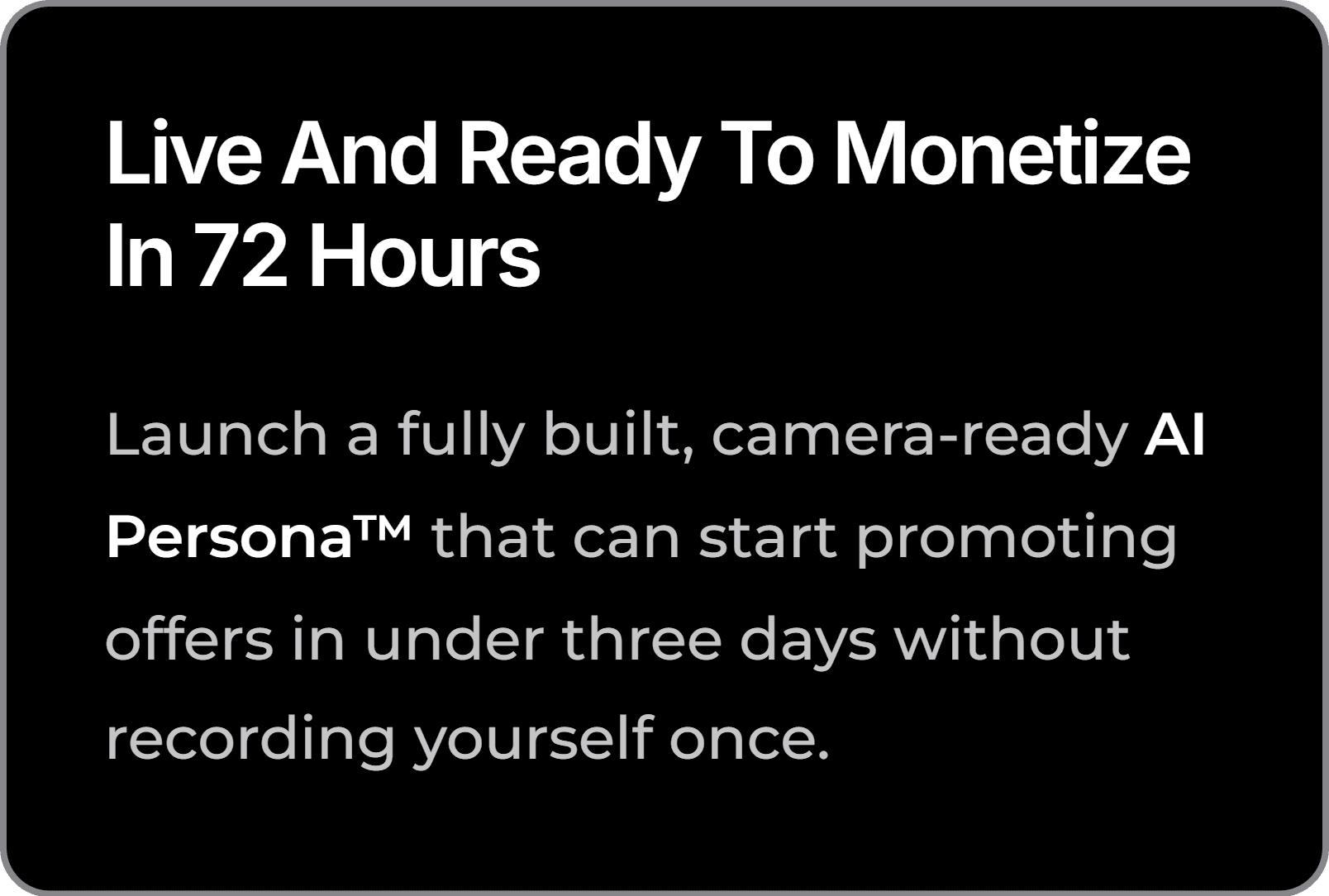Launch a fully built, camera-ready AI Persona™ that can start promoting offers in under three days without recording yourself once.