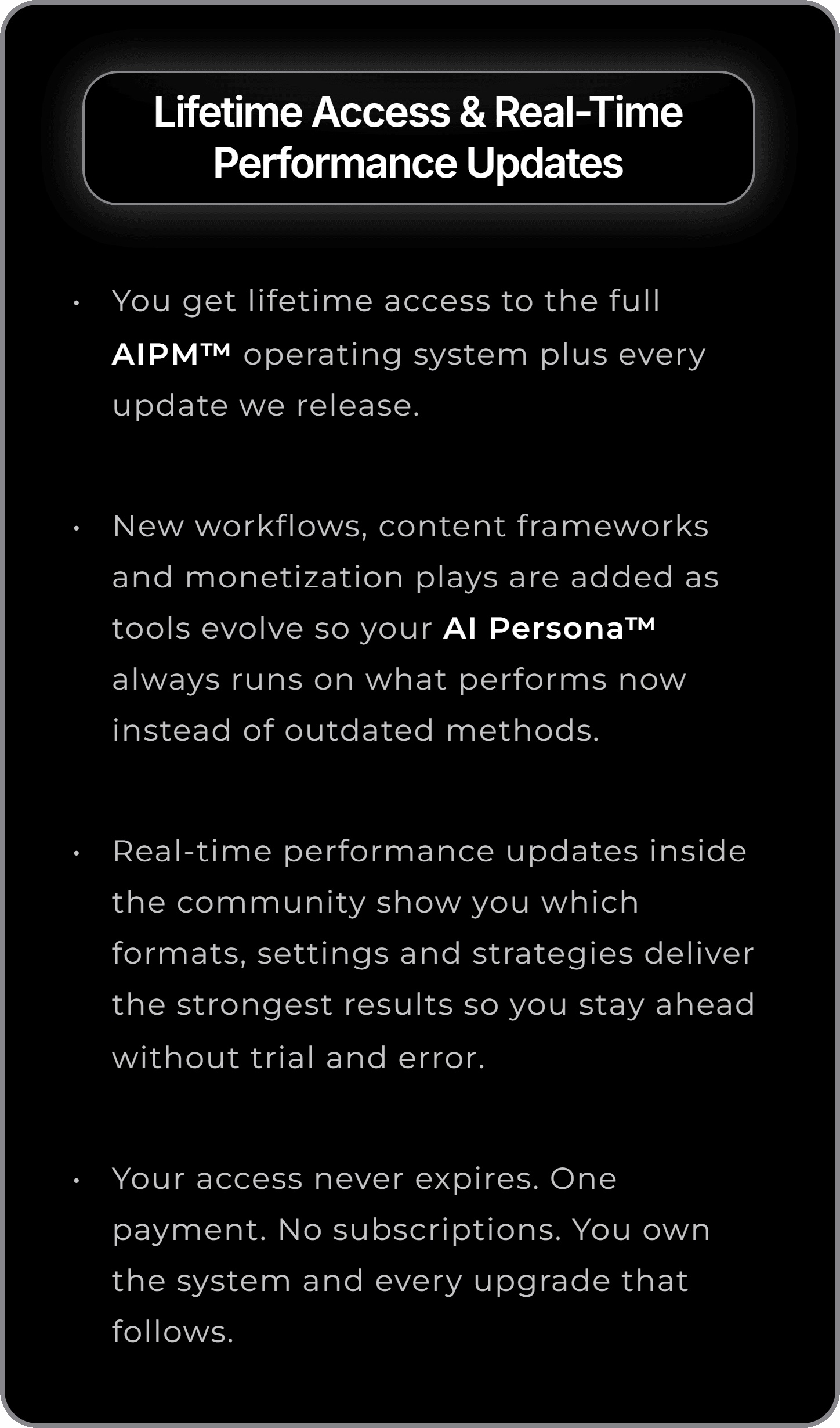 New workflows, content frameworks and monetization plays are added as tools evolve so your AI Persona™ always runs on what performs now instead of outdated methods.