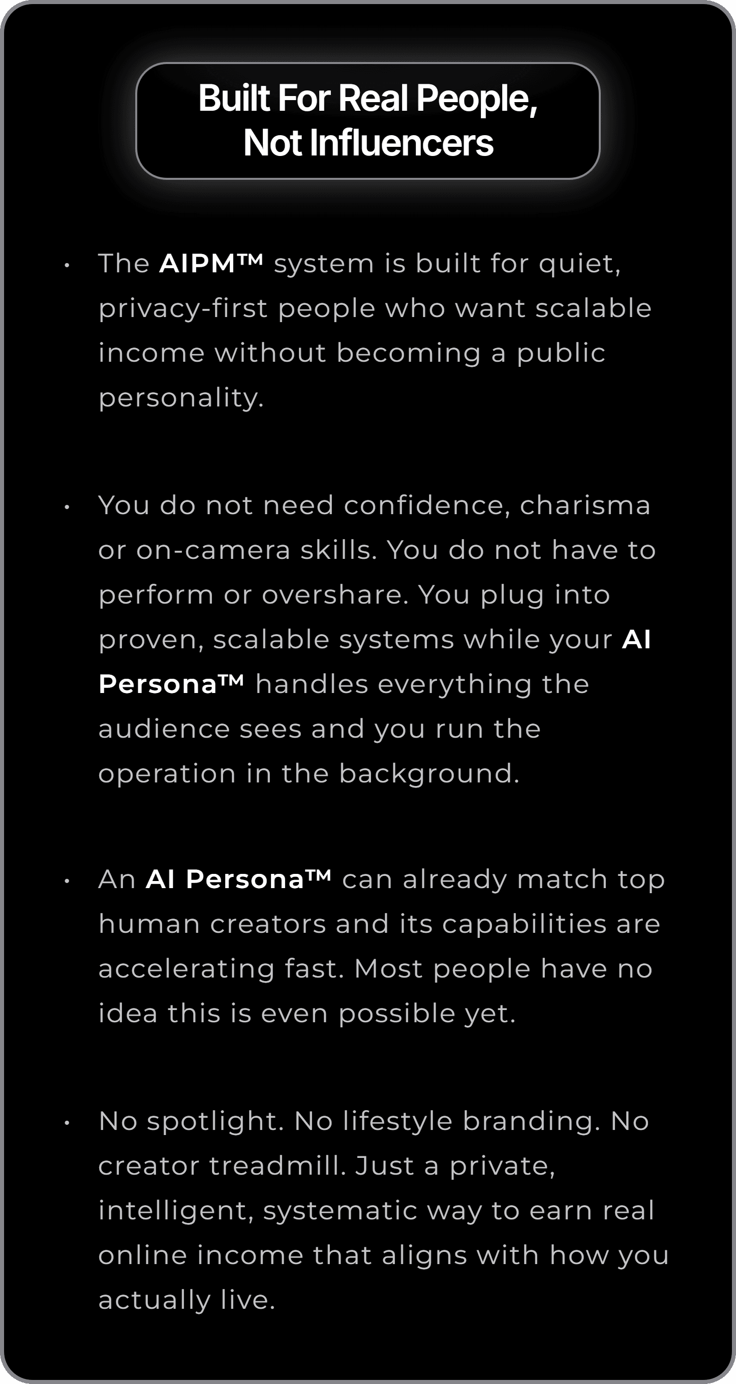 The AIPM™ system is built for quiet, privacy-first people who want scalable income without becoming a public personality.