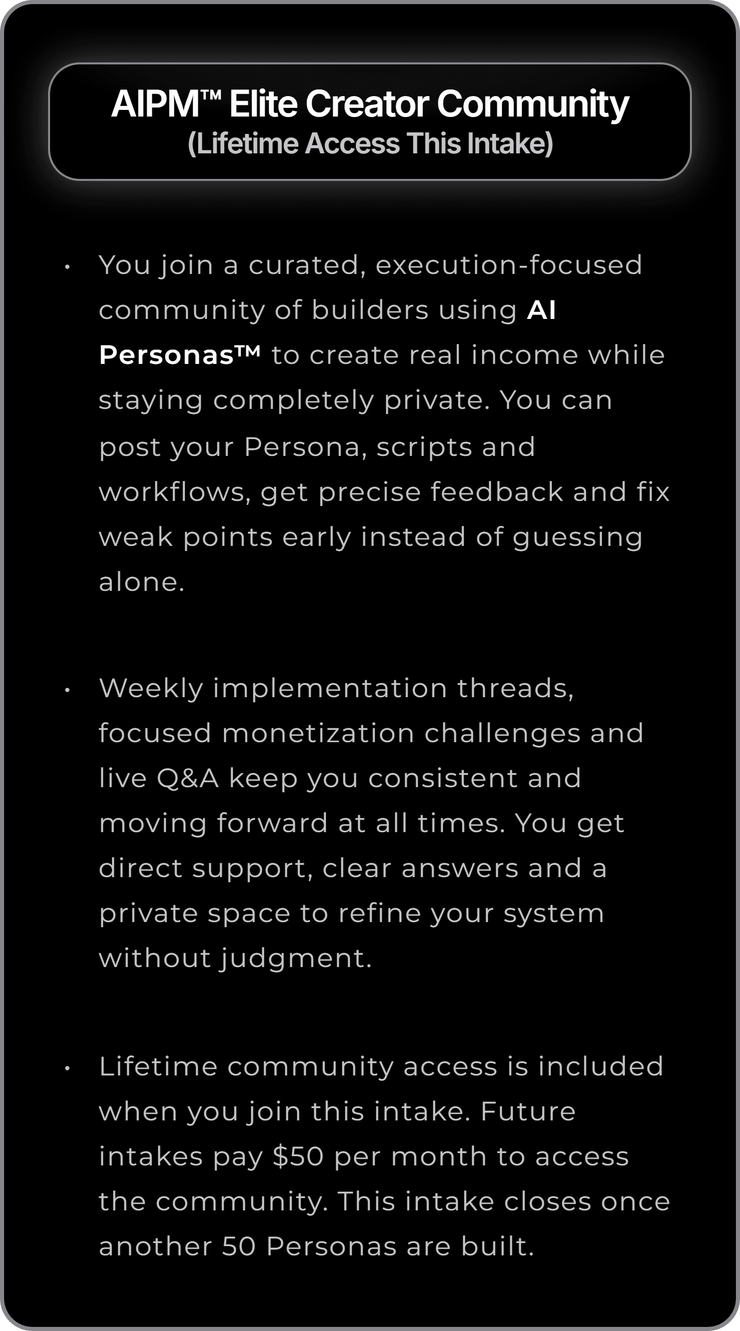 Lifetime community access is included when you join this intake. Future intakes pay $50 per month to access the community. This intake closes once another 50 Personas are built.