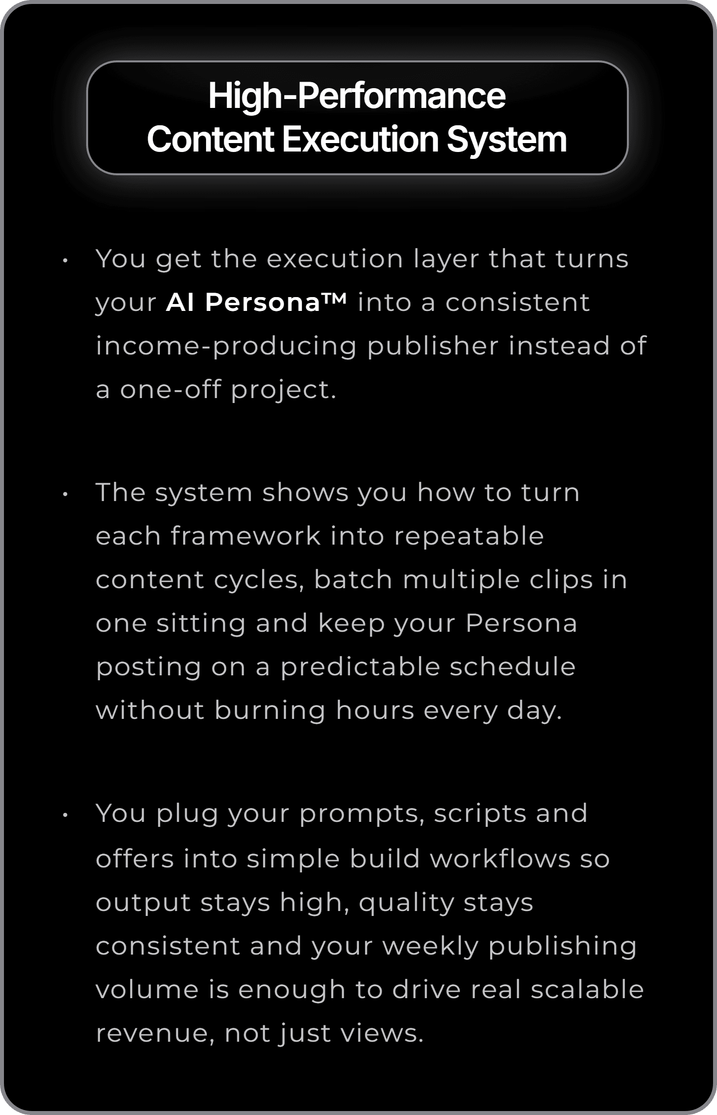 You get the execution layer that turns your AI Persona™ into a consistent income-producing publisher instead of a one-off project.