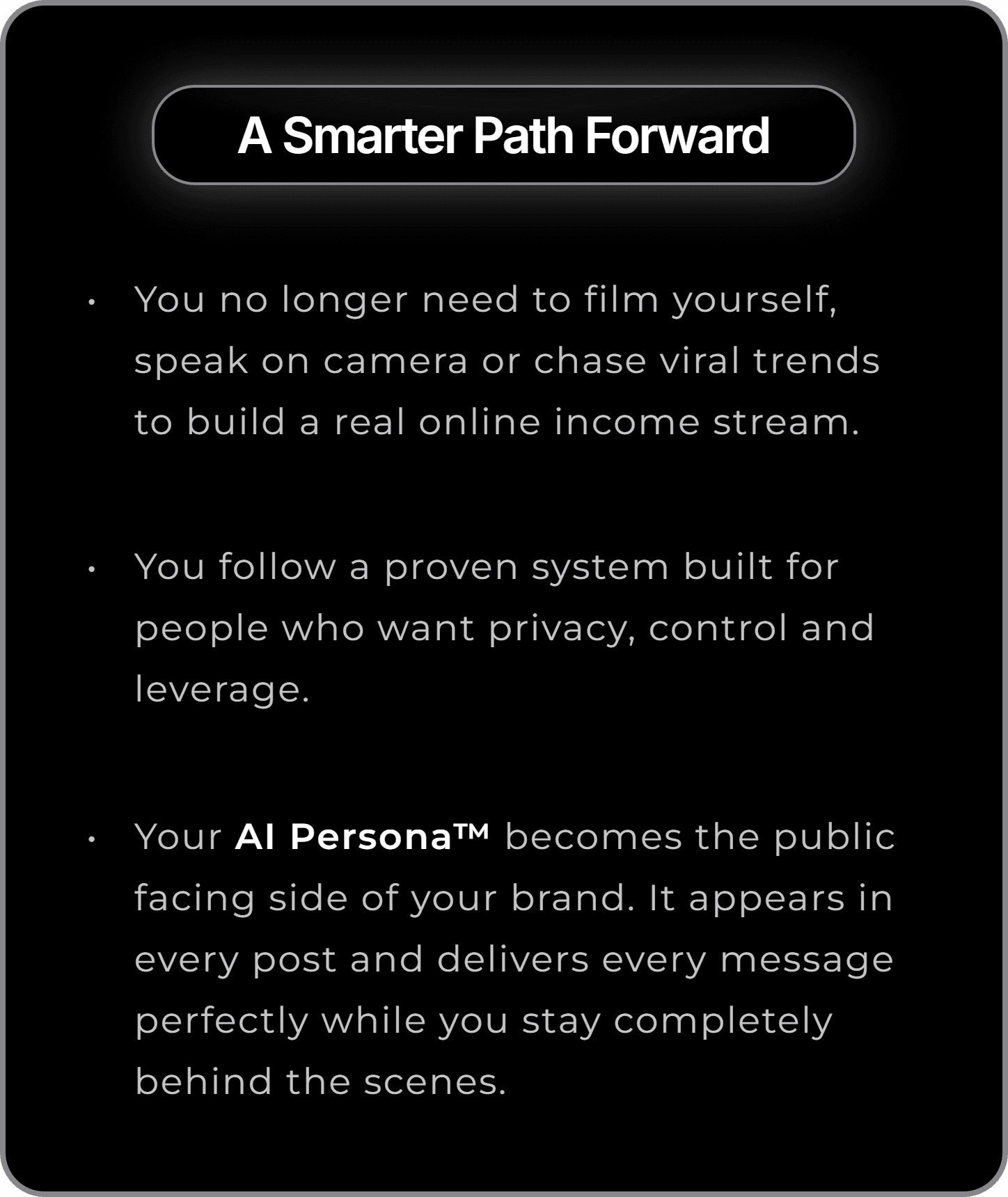 You do not need confidence, charisma or on-camera skills. You do not have to perform or overshare. You plug into proven, scalable systems while your AI Persona™ handles everything the audience sees and you run the operation in the background.