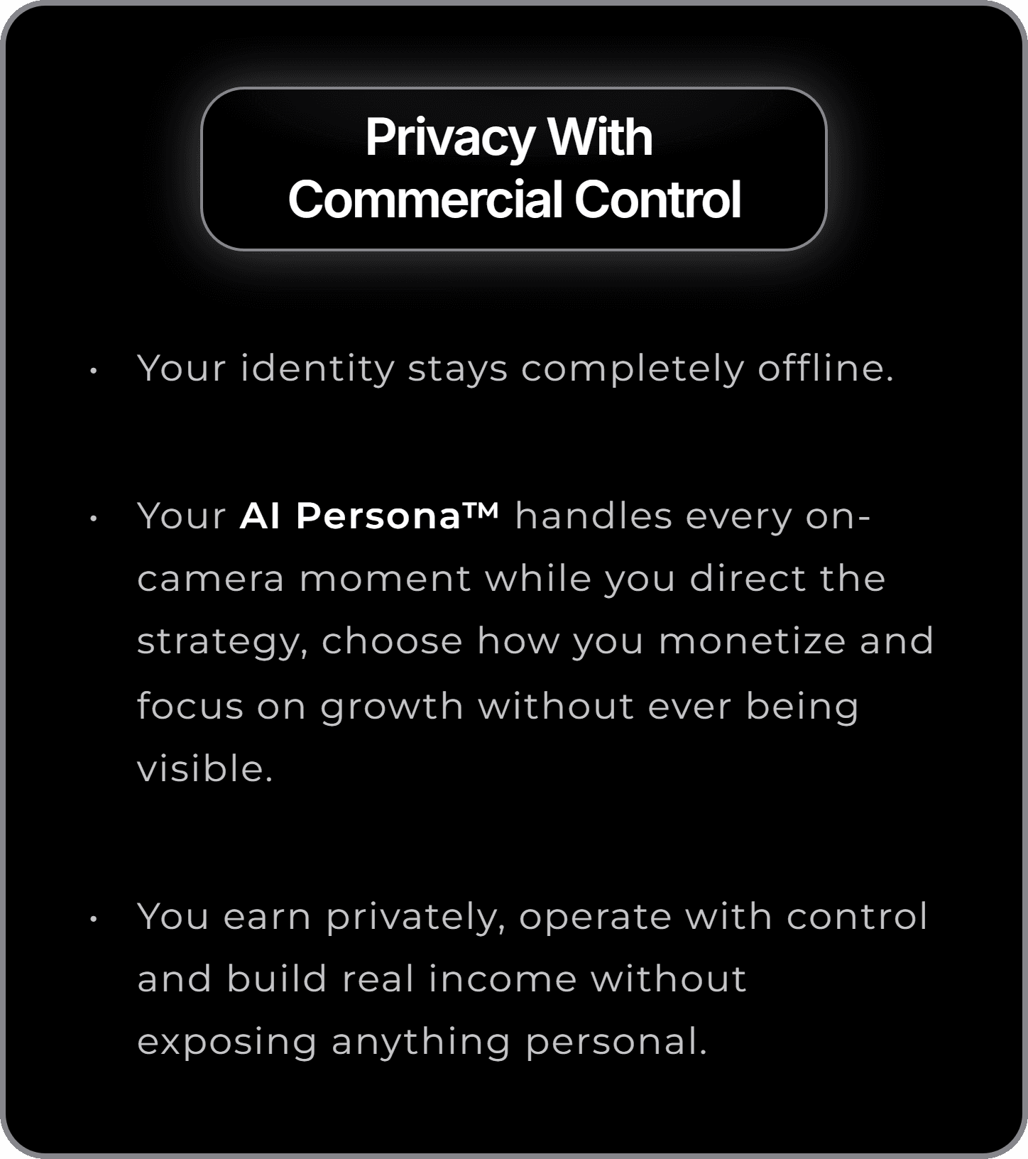 Your AI Persona™ handles every on-camera moment while you direct the strategy, choose how you monetize and focus on growth without ever being visible.