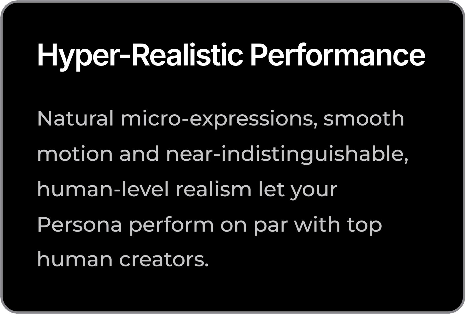 Natural micro-expressions, smooth motion and near-indistinguishable, human-level realism let your Persona perform on par with top human creators.