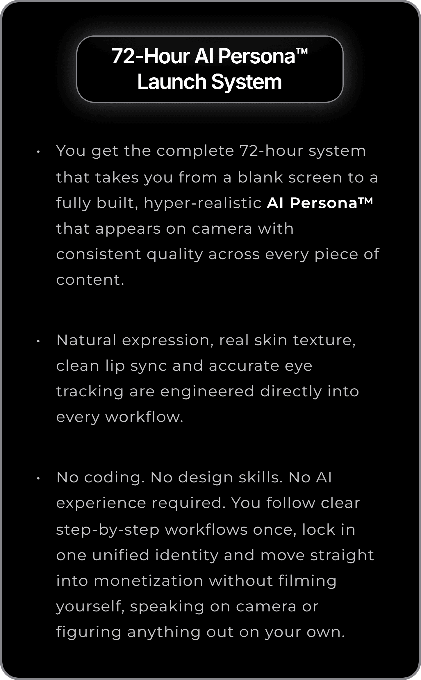 You get the complete 72-hour system that takes you from a blank screen to a fully built, hyper-realistic AI Persona™ that appears on camera with consistent quality across every piece of content.