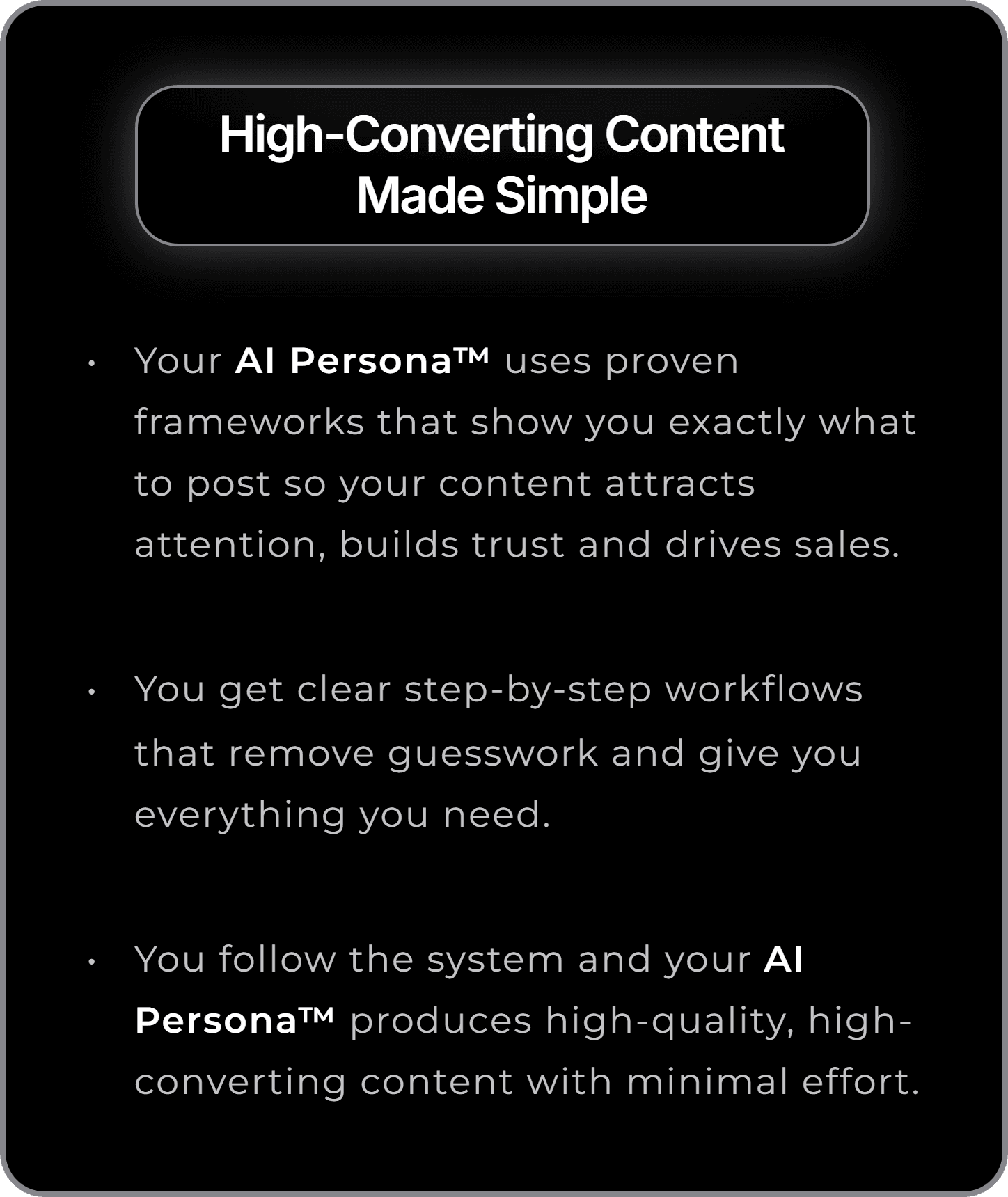 You follow the system and your AI Persona™ produces high-quality, high-converting content with minimal effort.